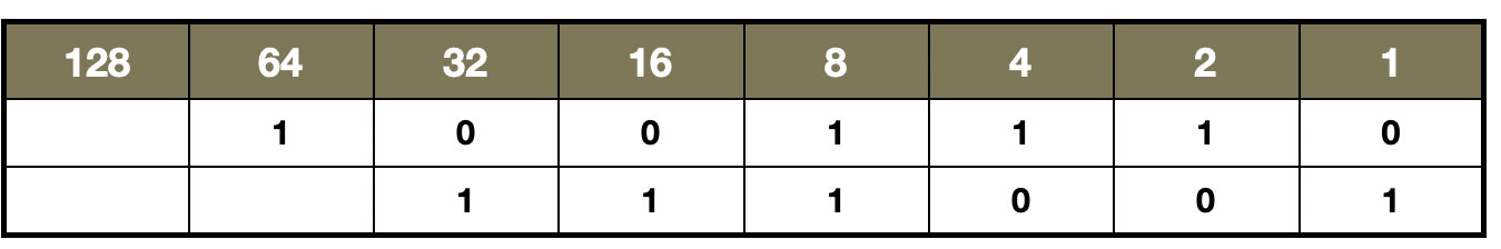 Die Binäzahl 1001110 in der Tabelle entspricht der Dezimahlzahl 78.
