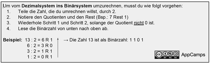Um eine Binärzahl in eine Dezimalzahl umzuwandeln, ist es am einfachsten sie in eine Tabelle einzutragen und alle Stellen, bei denen einen 1 steht, zu addieren. Zum Umrechnen einer Dezimalzahl in die Binärzahl gibt es ein einfaches Verfahren:
